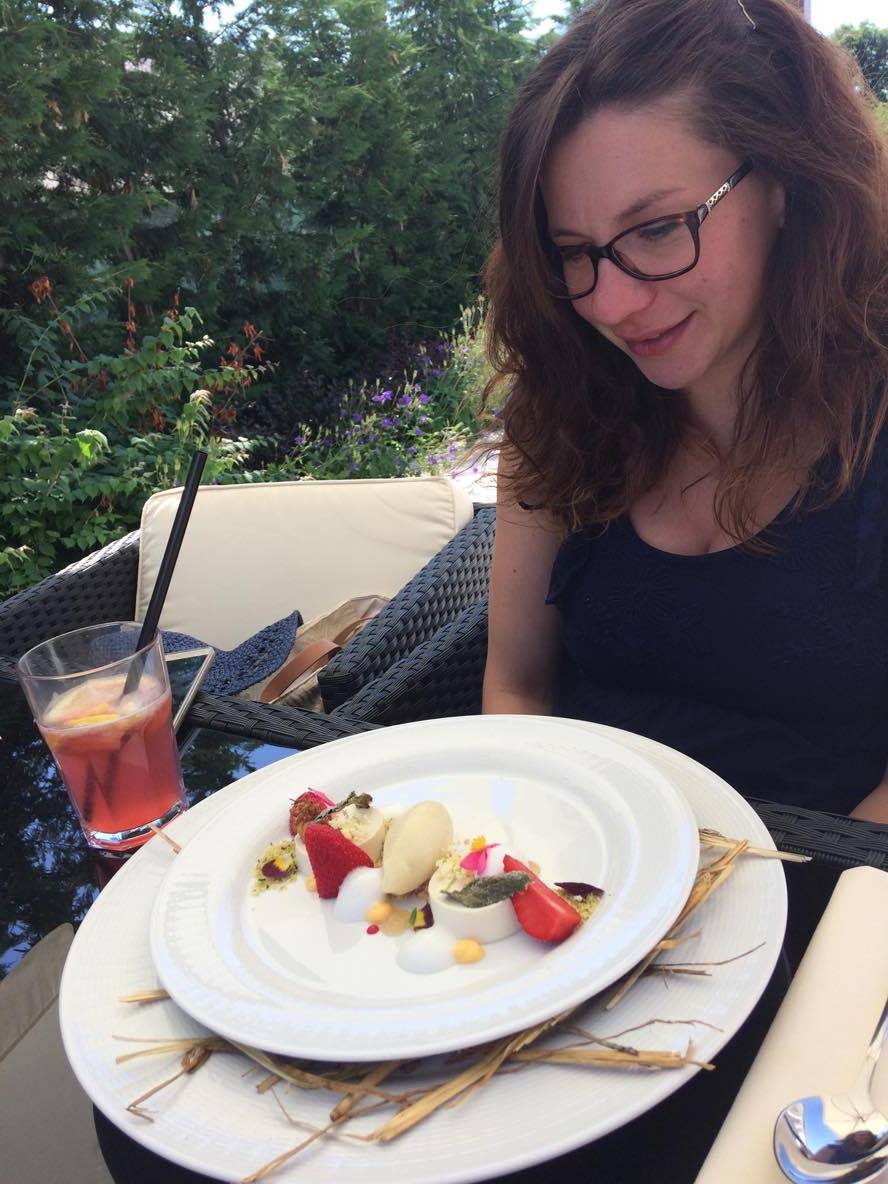 Igen, sült szalma! És tökéletes ízű eper, meg még vagy ötféle különböző szósz, és hab és krémpötty, és kis morzsák és bundás bodzavirágocska... Ez egy 2300 forintos desszert az év éttermében, az Isten háta mögött, Magyarországon. Életem desszertje, tényleg, tökéletes!